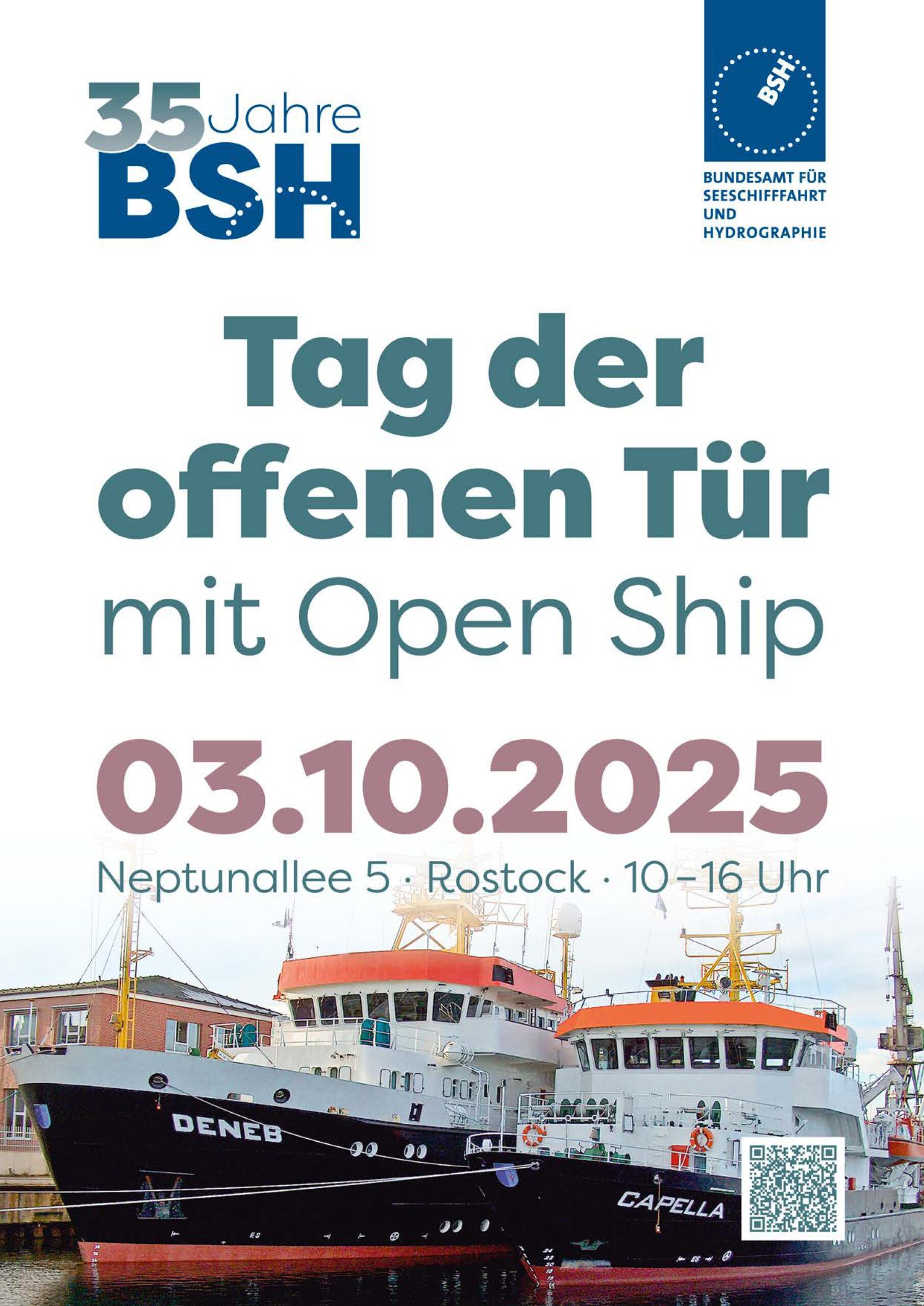 Das Bundesamt für Seeschifffahrt und Hydrographie lädt am 03. Oktober erneut zum Tag der offenen Tür ein. Von 10 bis 16 Uhr können Sie bei zahlreichen Vorträgen und Mitmachaktionen die Arbeit des BSH kennenlernen. Auch die Schiffe Capella und Deneb öffnen ihre Schotten um von Ihnen erkundet zu werden.